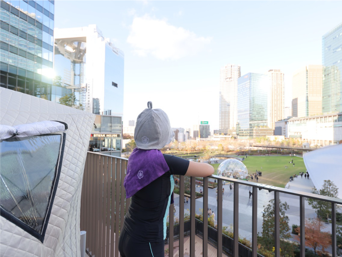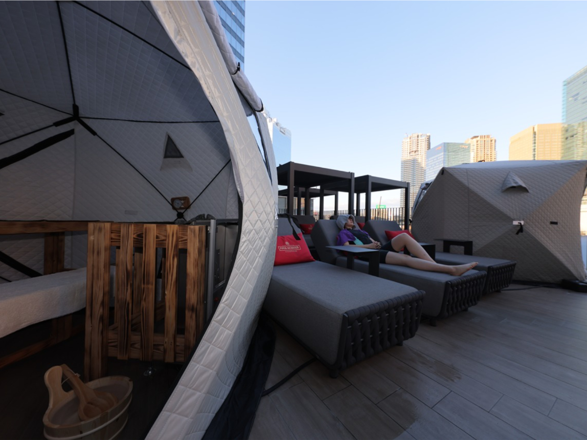 屋外温水インフィニティプールのプールサイドに、テントサウナが登場。 屋外ならではの空気感と開放的な景色に包まれながら、特別なサウナ体験を。